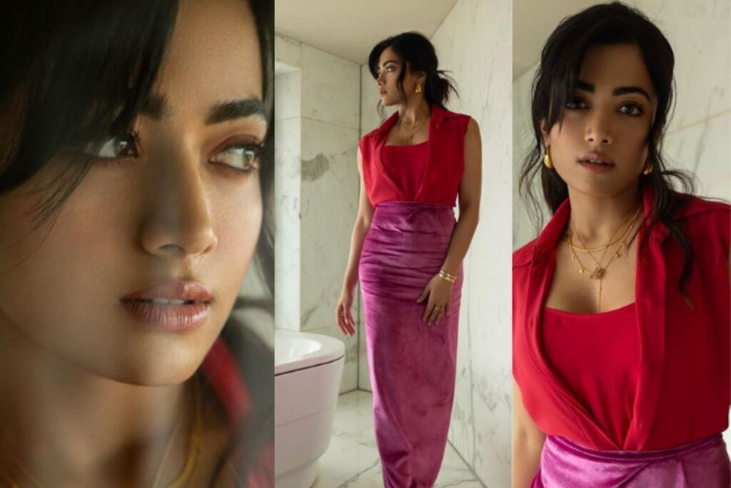 पुष्पा फिल्म में काम कर चुकी रश्मिका मंदाना आए दिन अपने फैंस के लिए इंस्टाग्राम पर कुछ नया अपडेट करती रहती हैं। इसी बीच रश्मिका ने एक फिर नया पोस्ट शेयर किया है जिसमें उन्होंने रेड नेकलाइन टॉप को बॉटम में लॉन्ग पिंक पेंसिल स्कर्ट के साथ स्टाइल किया है। अपने इस स्टाइलिश लुक को पूरा करने के लिए रश्मिका ने एकदम सिंपल मेकअप किया है और हेयर स्टाइल की बात करें तो रश्मिका ने बालों को मेसी अंदाज में बांधते हुए आगे के कुछ बालों को खुला छोड़ रखा है। रश्मिका ने कानों में हुप इयररिंग्स, गले में मल्टीलेयरड गोल्डन चैन और हाथों में गोल्डन रंग का ब्रेसलेट कैरी करके अपने इस ग्लैमर्स अंदाज को पूरा किया है। रश्मिका ने यह सभी फोटोस वॉशरूम में क्लिक की है। इस पूरे आउटफिट को मंदाना ने शाइनिंग पिंक कलर के हाई स्टिलेटो के साथ पहना हुआ है। इस तरह के आउटफिट में रश्मिका किसी बार्बी से कम नहीं लग रही है।