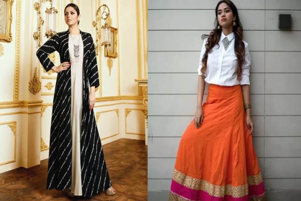 अगर आप केजुअल इंडो वेस्टर्न लुक कैरी करना चाहती हैं तो आप लॉन्ग कुर्ती के साथ जैकेट को भी ऐड कर सकती हैं। इस लुक को आप कैजुअल आउटिंग से लेकर ऑफिस तक पहन सकती हैं। इस लुक के साथ आप हाई हील्स को भी पेयर कर सकती हैं।