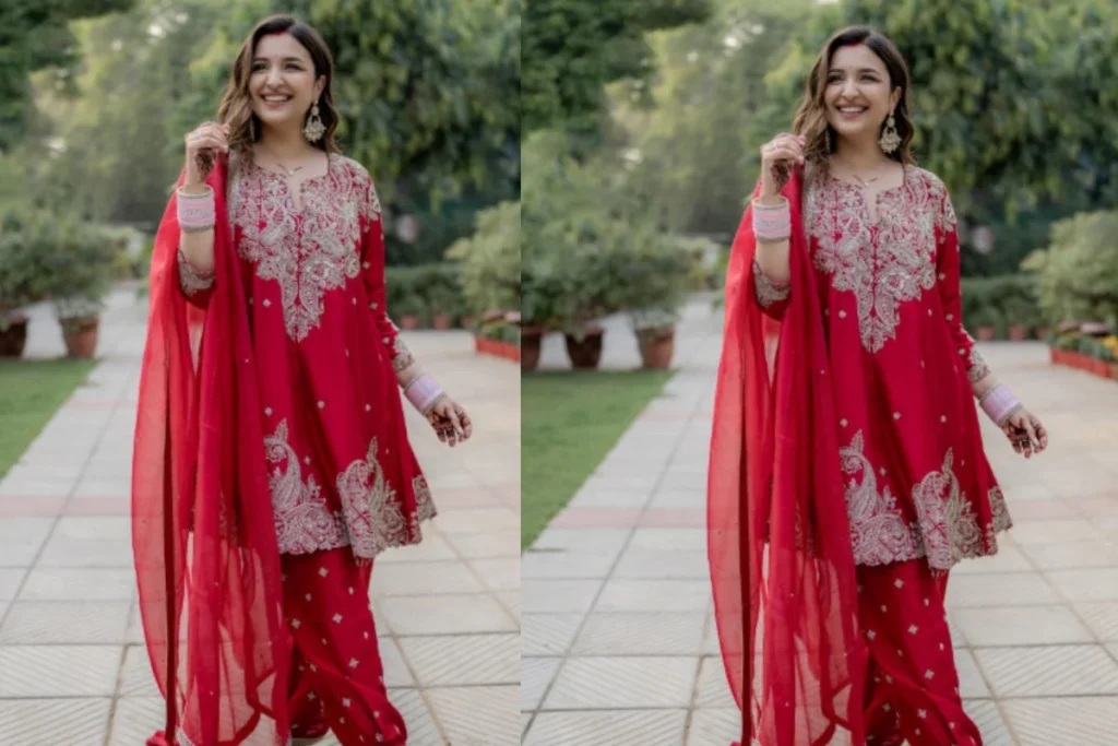 अगर आपको करवा चौथ पर साड़ी नहीं पहननी तो आप परिणीति चोपड़ा की तरह कुर्ता सेट को भी फ्लॉन्ट कर सकती हैं जो लोगों के बीच चर्चा में रह सकता है। ट्रेडिशनल लुक को कॉपी करते हुए आप करवा चौथ पर परिणीति चोपड़ा को फॉलो करें। होजरी के साथ पिंक चूड़ा, माथे में सिंदूर, लाल बिंदी के साथ बड़े इयररिंग्स और मंगलसूत्र से लुक में चार चांद लगा सकती हैं।