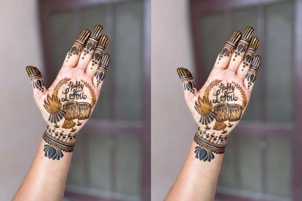 ट्रेंडी डिजाइन बनाना चाहते हैं तो लोहड़ी 2026 के मौके पर हैप्पी लोहड़ी मैसेज के साथ ढोलकी वाले इस मेहंदी डिजाइन को ट्राई कर सकती हैं जो दिखने में काफी खूबसूरत है। ढोलकी वाले इस मेहंदी डिजाइन में लोहड़ी की आग भी नजर आ रही है जो इसे और भी खूबसूरत बना रही है।