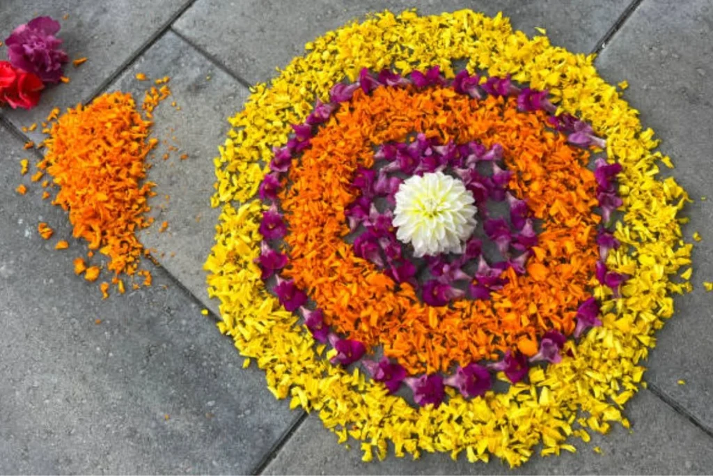 रंग-बिरंगे फूलों से बनाए रंगोली