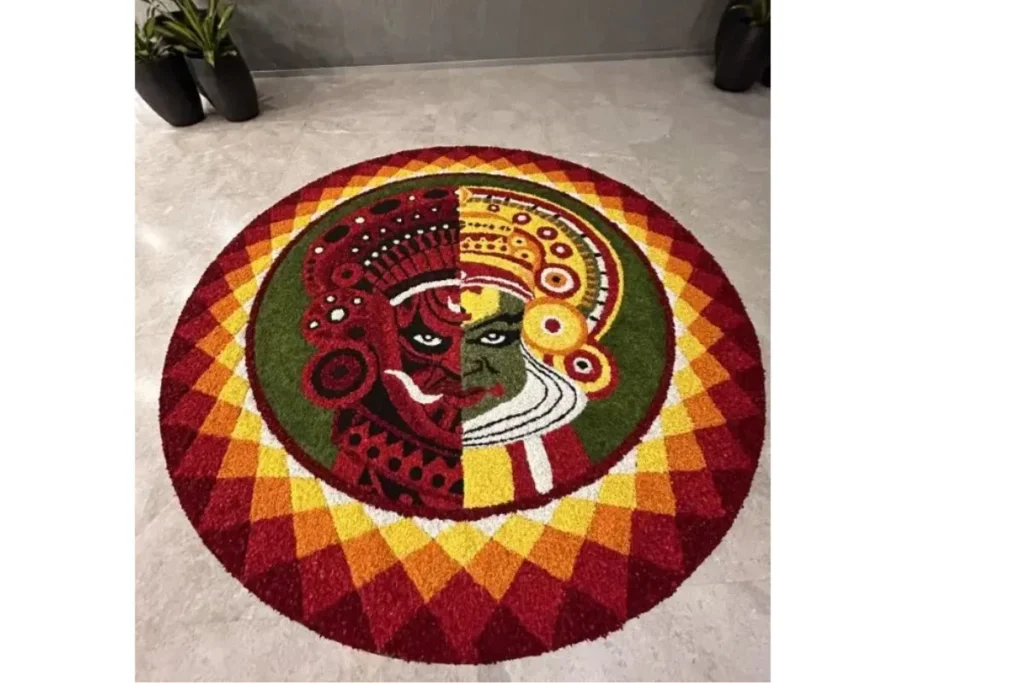 ओणम 2025 के दौरान अगर आप इस तरह से कथकली रंगोली डिज़ाइन तैयार करेंगे तो निश्चित तौर पर आपकी चर्चा पड़ोसियों के बीच होने वाली है। आपकी कथकली Rangoli Design के फैन हो जाएंगे। यह देखने में जितना खूबसूरत है उतना ही बनाने में आसान है। आपको सिर्फ रंगे हुए चावल की जरूरत पड़ेगी यह निश्चित तौर पर केरल के लिए खास रंगोली है।