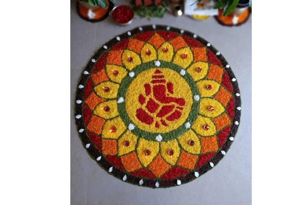 अगर आपको रंगोली बनाना है तो आप श्री गणेश का डिजाइन बना सकते हैं जो वाकई काफी खूबसूरत है और इसके लिए आपको रंग किए हुए चावल की जरूरत पड़ने वाली है इस तरह से आप रंगोली को कॉपी कर सकते हैं।