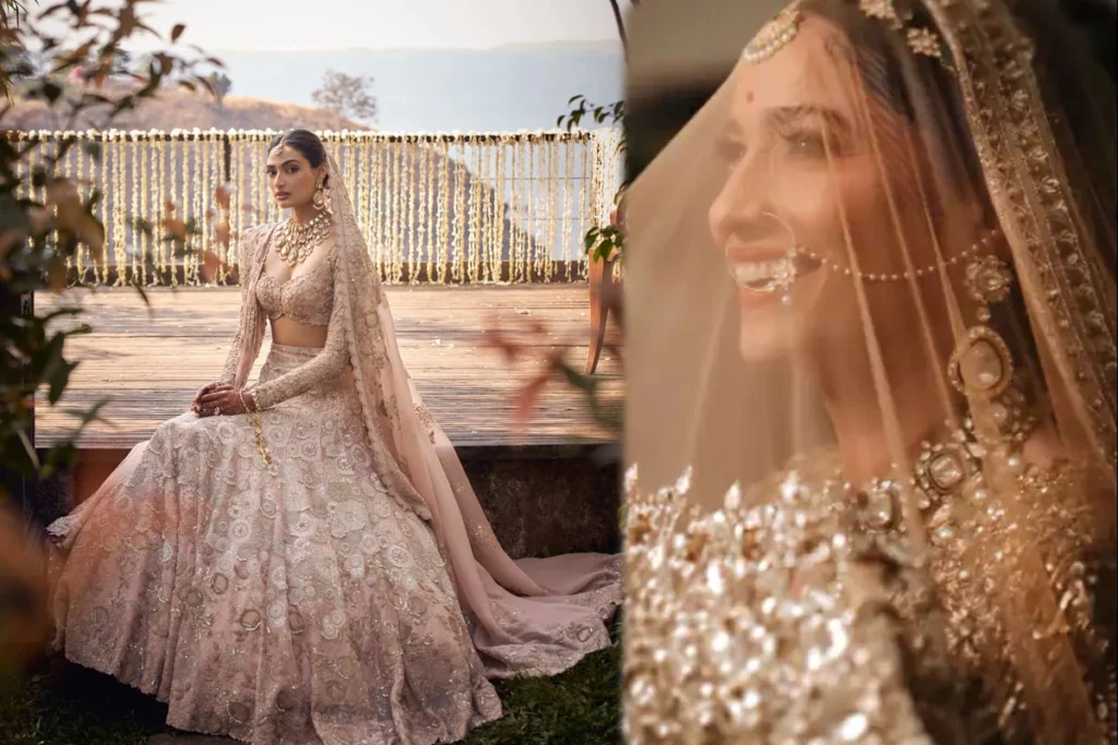हाल ही में दुल्हन बनी सुनील शेट्टी की बेटी अथिया शेट्टी इस बात को बखूबी बयां करती नजर आई कि सिर्फ रेड में ही नहीं लाइट कलर में भी दुल्हन कहर ढा सकती हैं। आप भी अथिया को फॉलो कर सकती हैं। खास दिन पर अथिया ने पेस्टल पिंक कलर का हैवी एम्बेलिश्ड लहंगा कैरी करती नजर आईं। आप भी इस तरह के लहंगे को चुन सकती हैं और ज्वेलरी के लिए भी अथिया के लुक को कॉपी कर सकती हैं। यह आपके लुक को रॉयल टच देने में परफेक्ट ऑप्शन है।