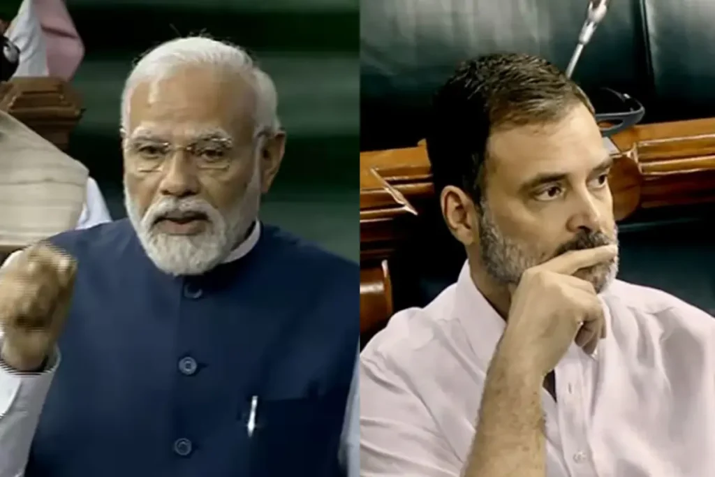 Narendra Modi: गहमा-गहमी के बीच आज प्रधानमंत्री नरेन्द्र नोदी (Narendra Modi) ने लोकसभा को संबोधित किया। उन्होंने संविधान की 75 वर्ष की गौरवशाली यात्रा पर चर्चा के दौरान कांग्रेस पर जमकर निशाना साधा है। पीएम मोदी (PM Modi) ने आर्टिकल 370 (Article 370) और आपातकाल (Emergency) का जिक्र कर कांग्रेस पर जमकर निशाना साधा। इस दौरान नेता प्रतिपक्ष राहुल गांधी (Rahul Gandhi) मुंह ताकते नजर आए। पीएम मोदी ने कहा कि “आर्टिकल 370 देश की एकता में दीवार बना हुआ था, इसलिए हमने इसे जमीन में गाड़ दिया।”