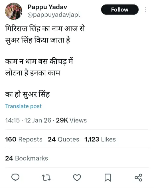 पप्पू यादव के एक्स हैंडल से पोस्ट जारी कर लिखा गया है कि “गिरिराज सिंह का नाम आज से सुअर सिंह किया जाता है। काम न धाम बस कीचड़ में लोटना है इनका काम। का हो सुअर सिंह।” पूर्णिया सांसद की ये तल्ख प्रतिक्रिया बिहार से इतर देश के विभिन्न हिस्सों में सुर्खियां बटोर रही है। भाषाई मर्यादा को लगभग तार-तार करने वाले इस बयान को लेकर प्रतिक्रियाओं का दौर जारी है।