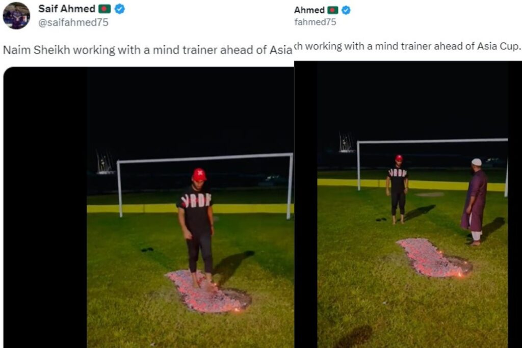 Asia Cup 2023: एशिया कप 2023 के मैच इस साल श्रीलंका और पाकिस्तान की संयुक्त मेजबानी में खेला जाएगा। आपको बता दें कि एशिया कप का आयोजन 30 अगस्त से 17 सितम्बर तक श्रीलंका और पाकिस्तान के अलग-अलग हिस्सों में किया जाएगा। अब जाकर इन दिनों एक बांग्लादेशी क्रिकेटर का वीडियो सोशल मीडिया पर खूब वायरल हो रहा है जिसमें वह आग के बीच पैर डाले बिलकुल बेख़ौफ़ नजर आ रहे हैं।मीडिया रिपोर्ट्स के मुताबिक़ कहा जा रहा है कि नईम एशिया कप से पहले खुद को मेंटली तौर पर फिट करने के लिए इस तरह का अभ्यास कर रहें हैं।