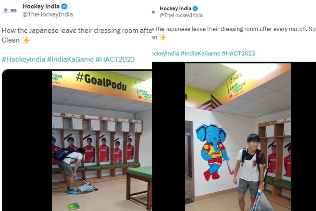 तमिलनाडु की राजधानी चेन्नई में इन दिनों एशियाई चैंपियंस ट्रॉफी के मैचेज चल रहे हैं। आपको बता दें कि भारतीय टीम ने टूर्नामेंट के सेमीफाइनल में अपना स्लॉट पहले ही बुक कर लिया है। अब जाकर सोशल मीडिया पर इन दिनों एक वीडियो खूब वायरल हो रहा है जिसमें जापान की टीम को मैच खत्म होने के बाद अपने कमरे को साफ़ करते हुए देखा जा सकता है। हॉकी इंडिया द्वारा शेयर किये गए वीडियो में साफ़-साफ़ देखा जा सकता है कि किस तरह जापान की हॉकी प्लेयर्स अपने कमरे को क्लीन करते दिखाई दे रहे हैं। इस वीडियो के शेयर होते ही लोग जापानीज टीम के इस काम की तारीफ करते नहीं थक रहे हैं।