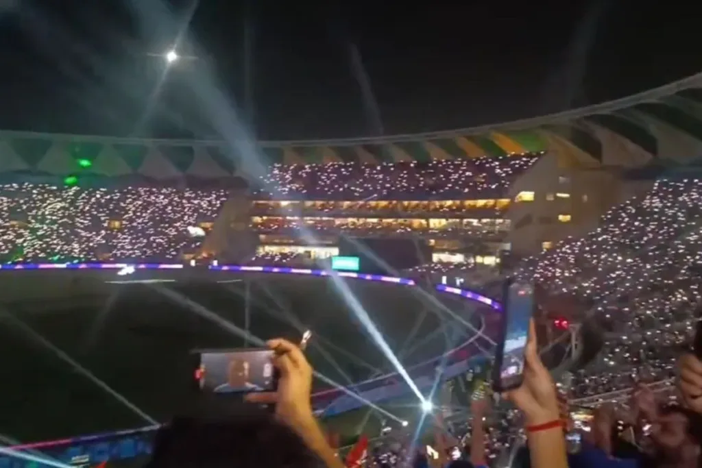 इंग्लैंड को रोमांचक मुकाबले में लंबे मार्जिन से हराने के बाद पूरे देश में खुशी की लहर है। इकाना स्टेडियम में डिफेंडिंग चैंपियंस को हराते ही पूरा स्टेडियम रोशनी से जगमगा उठा। साथ ही स्टेडियम में मौजूद भारतीय क्रिकेट फैंस भारत की जीत को सेलिब्रेट करते हुए ‘वंदे मातरम’ एक साथ गाया। स्टेडियम का ये नजारा देखते ही बनता है। स्टेडियम का ये वीडियो सोशल मिडिया पर खूब वायरल हो रहा है।