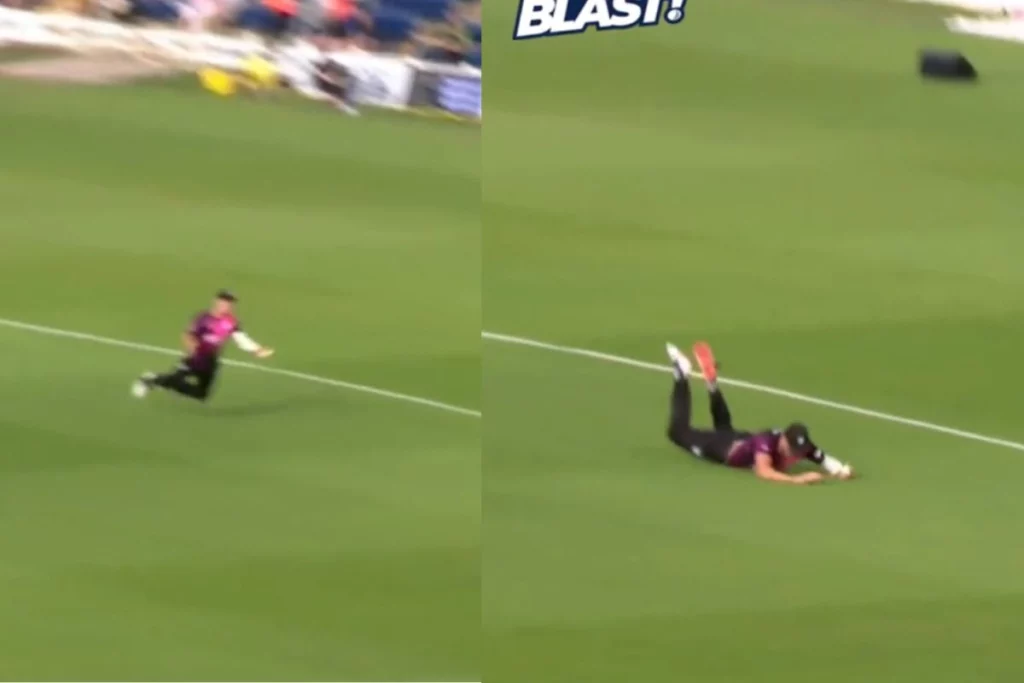 Cricket Viral Video:  टी20 ब्लास्ट में एक से बढ़कर एक मुकाबले खेले जा रहे है। इस सीजन में एक अलग ही प्रकार का जोश और जज्बा दुनिया भर के बेहतरीन क्रिकेटरों में दिखाई दे रहा है। बीते बुधवार को खेले गए मुकाबला का एक वीडियो वायरल हो रहा है। जिसमें इंग्लिश खिलाड़ी अपनी जान की परवाह नहीं करते हुए एक हाथ से गजब का कैच लपक रहे है। जिसका अंदाजा आप वायरल वीडियो को देख कर लगा सकते है।