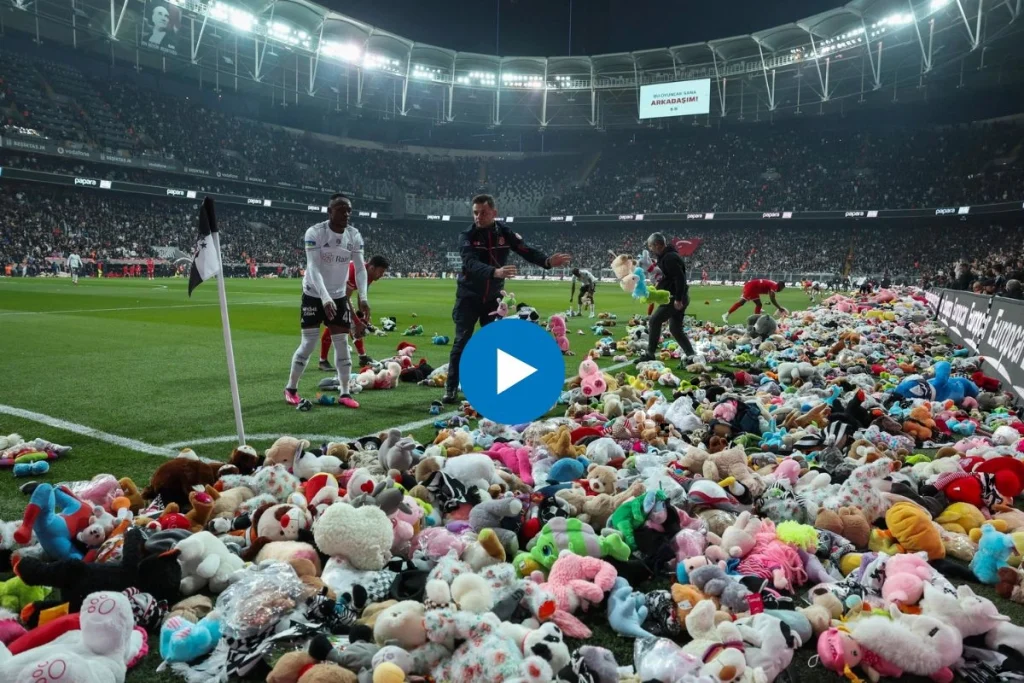 Teddy bears rained onto a football pitch during a match in Turkey, as Besiktas fans donated toys for child survivors of the devastating earthquakes.#TurkeyEarthquake pic.twitter.com/GA2KWptfRa