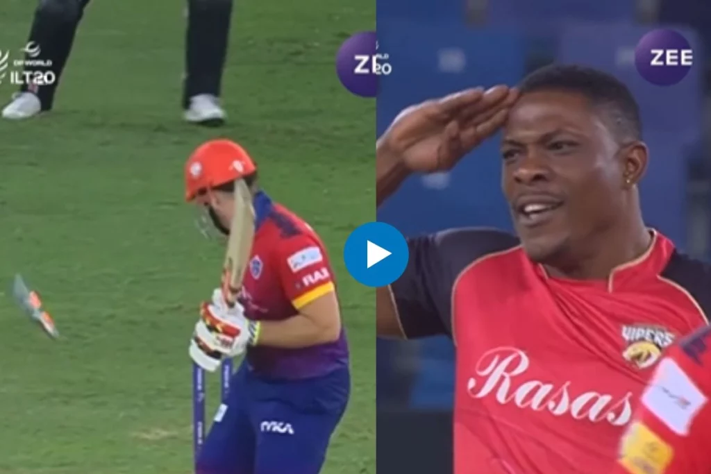 ILT20 2023: UAE में खेले जा रहे इंटरनेशनल लीग टी20 में कल (ILT20 2023) 25वां मैच दुबई कैपिटल बनाम डेजर्ट वाइपर के बीच मैच खेला गया। इस मुकाबले में डेजर्ट वाइपर ने 22 रनों से मैच में जीत हासिल की। लेकिन इस मैच का एक वीडियो सोशल मीडिया पर जमकर वायरल हो रहा है। जिसमें तेज गेंदबाज शेल्डन कॉटरेल (Sheldon Cottrell) ने बल्लेबाज जॉर्ज मुन्से (George Munsey) को बेहतरीन तरीके से बोल्ड मारकर शानदार तरीके से जश्न मनाया।