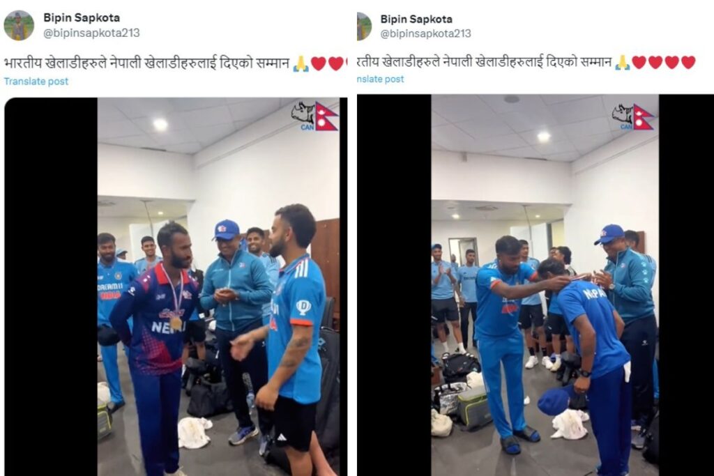 भारत के हरफनमौला बल्लेबाज विराट कोहली कि हाल में आयी एक वीडियो सोशल मीडिया पर खूब वायरल हो रही है। आपको बता दें कि विराट इस दौरान नेपाली टीम के कैप्टेन आसिफ शेख को मेडल पहनाते नजर आ रहे हैं। विराट कोहली के इस जेस्चर को देखकर अब फैंस उनकी तारीफों के पूल बांधते नहीं थक रहे। विराट कोहली के अलावे हार्दिक पांड्या और राहुल द्रविड़ भी इस दौरान नेपाली खिलाड़ियों को मेडल पहनाते नजर आ रहे हैं।ट्विटर यूजर बिपिन सपकोटा ने इस वीडियो को शेयर किया है।
