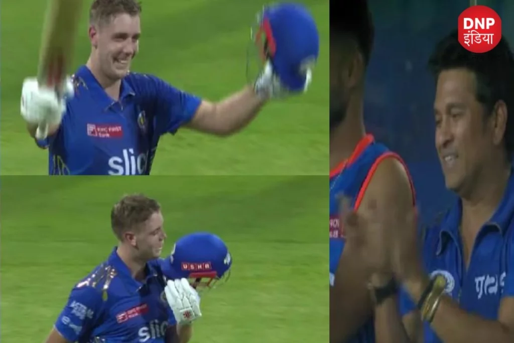 दरअसल, टीम को जीत के लिए 201 रनों की आवश्यकता थी कप्तान रोहित शर्मा ने ईशान किशन के आउट होने के बाद कैमरून ग्रीन को पहले पायदान पर सूर्यकुमार की जगह बल्लेबाजी करने के लि भेजा। उन्होंने मैदान पर आते ही विपक्षी टीम के गेंदबाजी क्रम पर आक्रमण करना शुरू कर दिया। वहीं 18वें ओवर की आखिरी गेंद पर सिंगल रन लेकर उन्होंने अपने आईपीएल करियर का पहला शतक पूरा किया। वहीं शतक के साथ ही ग्रीन मैदान के चारो तरफ चक्कर मार कर जश्न मनाते हुए नजर आए। वहीं क्रिकेट के भगवान सचिनने उनकी गजब की पारी की सरहाना अपना सिर झुका कर की। जिसका अंदाजा आप वायरल हो रही वीडियो को देख कर लगा सकते है।