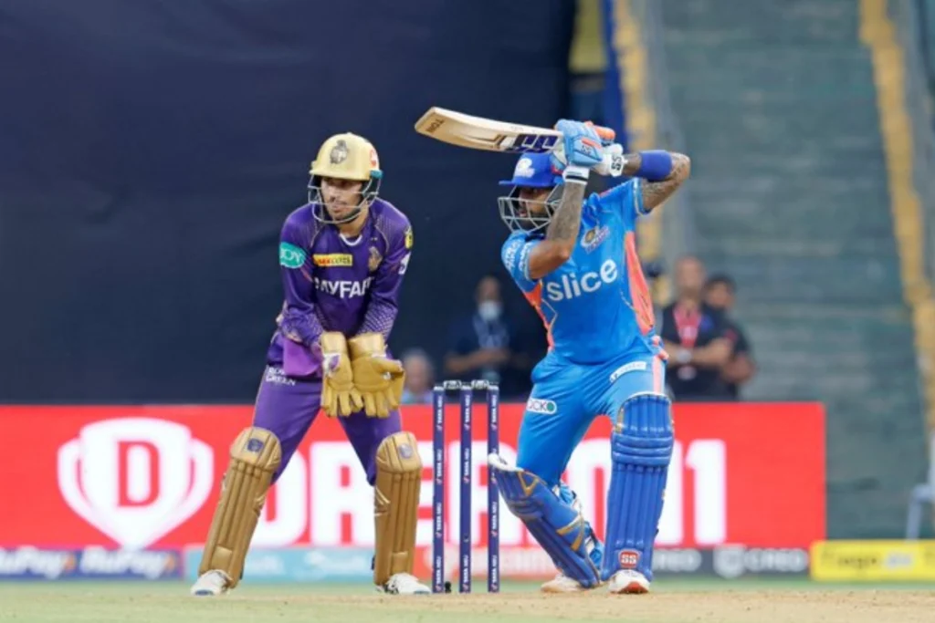 केकेआर टीम ने पहले बल्लेबाजी करते हुए 20 ओवर में 185 रन बनाए। केकेआर के लिए सबसे अधिक रन वेकटेंश अय्यर ने बनाए। वेंकटेंश अय्यर ने शानदार बल्लेबाजी करते हुए इस सीजन का दूसरा शतक जड़ा। वेंकटेश अय्यर ने शानदार बल्लेबाजी करते हुए 51 गेंदों पर 104 रनों की पारी खेली। इस दौरान 6 चौके और 9 छक्के लगाए। लेकिन वेंकटेश अय्यर के अलावा टीम कोई बल्लेबाज बड़ी पारी नहीं खेल पाया। मुंबई इंडियंस के लिए सबसे सफल गेंदबाज ऋतिक शौकीन रहे। ऋतिक शौकीन ने 4 ओवर में 34 रन देकर 2 विकेट लिए हैं।