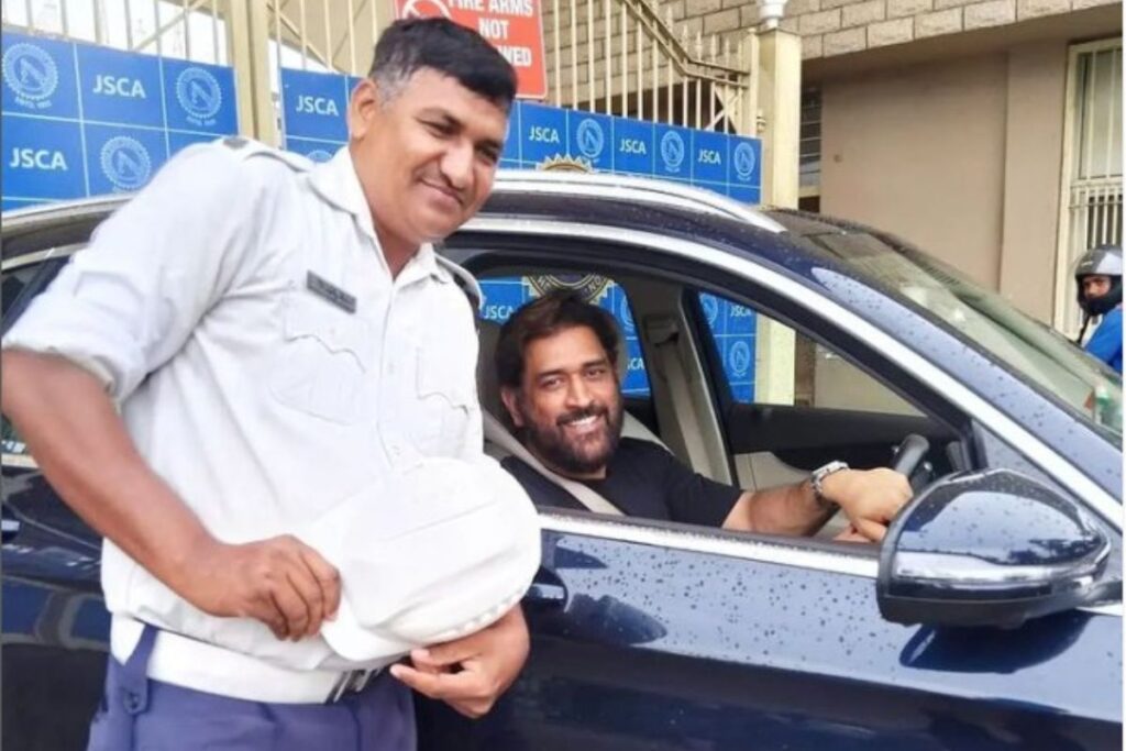 भारत के वर्ल्ड कप विनिंग कप्तान महेंद्र सिंह धौनी हमेशा अपने कामों की वजह से सुर्ख़ियों में बने रहते हैं। अब जाकर धौनी की एक तस्वीर इन दिनों सोशल मीडिया पर खूब वायरल हो रही है जिसमें वह अपने एक फैन के साथ तस्वीर क्लिक करते नजर आ रहे हैं। आपको बता दें कि धौनी इन दिनों झारखंड की राजधानी रांची में हैं। अब जाकर माही की एक तस्वीर खूब वायरल हो रही है जिसमें वह झारखंड स्टेट क्रिकेट एसोसिएशन स्टेडियम के बाहर एक पुलिसमैन के साथ तस्वीर क्लिक करवाते दिख रहे है। दरअसल धौनी झारखण्ड स्टेट क्रिकेट एसोसिएशन स्टेडियम रेगुलर जाते रहते हैं। आपको बता दें धोनी की एक वीडियो भी इससे पहले खूब वायरल हुई थी जिसमें वह Rolls Royce कार चलाते नजर आ रहे थें।
