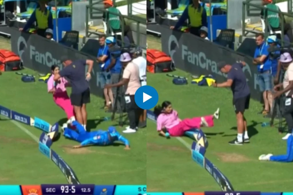 SA20 लीग में कल एक मजेदार दृश्य देखने को मिला जिसमें स्पोर्ट्स फील्ड की मशहूर एंकर जैनब अब्बास को फील्डर ने धक्का मार दिया जिसके बाद वह बाउंड्री लाइन पर ही गिर पड़ी। दरअसल, कल खेले गए मैच में जब सनराइजर्स ईस्टर्न केप टीम बल्लेबाजी कर रही थी और सनराइजर्स टीम के ऑलराउंडर मार्को जानसन ने फुल लेंथ गेंद पर एक शॉट खेला और गेंद बाउंड्री तरफ जा रही थी। इस दौरान फील्डर ने गेंद रोकने की कोशिश की और बाउंड्री लाइन पर खड़ी एंकर से जा टकरा गया और जैनब अब्बास तुरंत गिर पड़ी। हालांकि, जैनब अब्बास को कोई चोट नहीं आई है और वह एकदम सुरक्षित हैं।