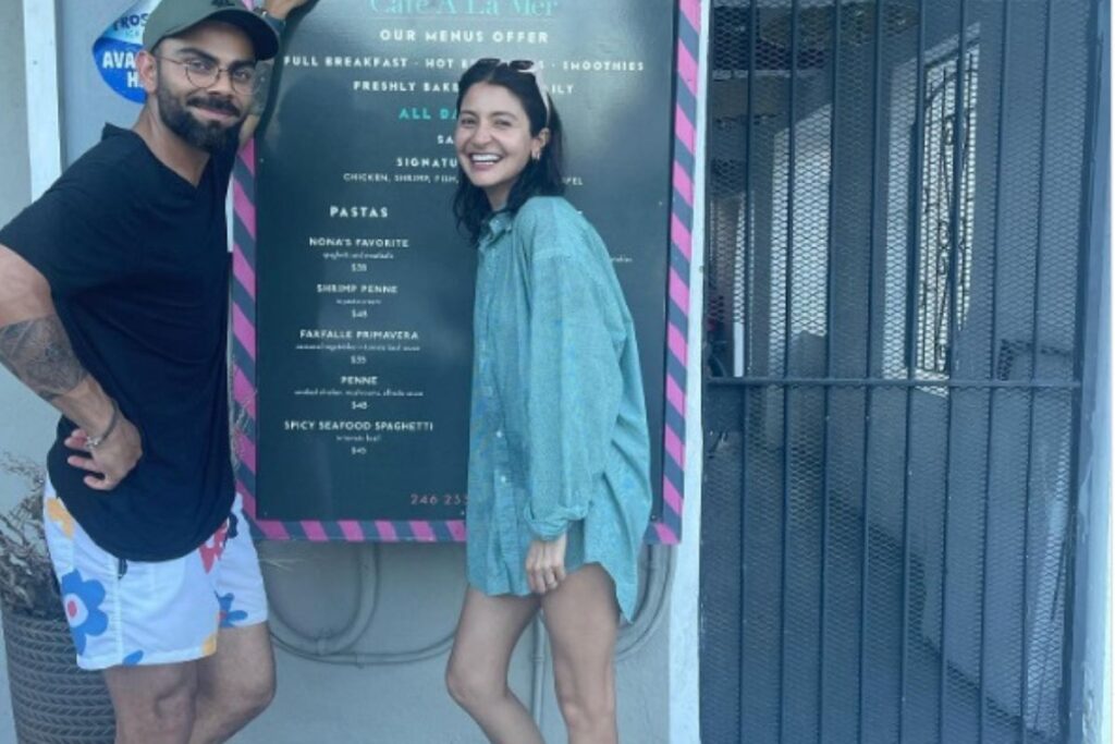 भारत के हुनरमंद बल्लेबाजों में से एक विराट कोहली इन दिनों अपनी वाइफ अनुष्का शर्मा के साथ छुट्टियां मना रहे हैं। आपको बता दें कि विराट और अनुष्का की सोशल मीडिया पर एक तस्वीर खूब वायरल हो रही है जिसमें इस खूबसूरत जोड़ी को मस्ती करते हुए देखा जा सकता है। तस्वीर में विराट और अनुष्का बारबाडोस के एक कैफे के बाहर खड़े दिखाई दे रहे हैं। इस तस्वीर में विराट ब्लू टी शर्ट और प्रिंटेड हॉफ पैंट पहने दिखाई दे रहे हैं तो वही अनुष्का शर्मा काफी लम्बी टी शर्ट पहने दिख रही हैं। आपको बता दें कि विराट ने इंस्टाग्राम पर तस्वीर के साथ कैप्शन में लिखा कि ,आप सभी को बारबाडोस जरूर आना चाहिए। हमने यहां पर सबसे बेहतरीन फ़ूड को एन्जॉय किया।