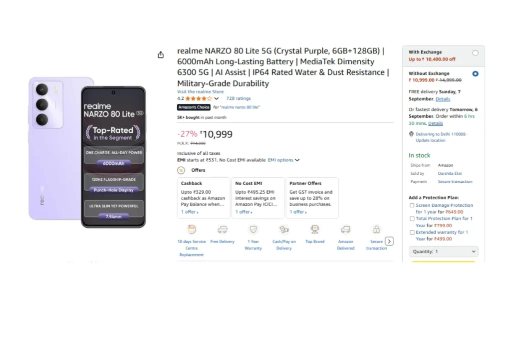 Realme NARZO 80 Lite 5G स्मार्टफोन को अमेजन ग्रेट इंडियन फेस्टिवल सेल स्टार्ट होने से पहले 27 प्रतिशत कम दाम पर पोस्ट किया गया है। इसका प्राइस 14999 रुपये रखा गया है। मगर ऑफर में इसे 10999 रुपये का भुगतान करके अपना बना सकते हैं।