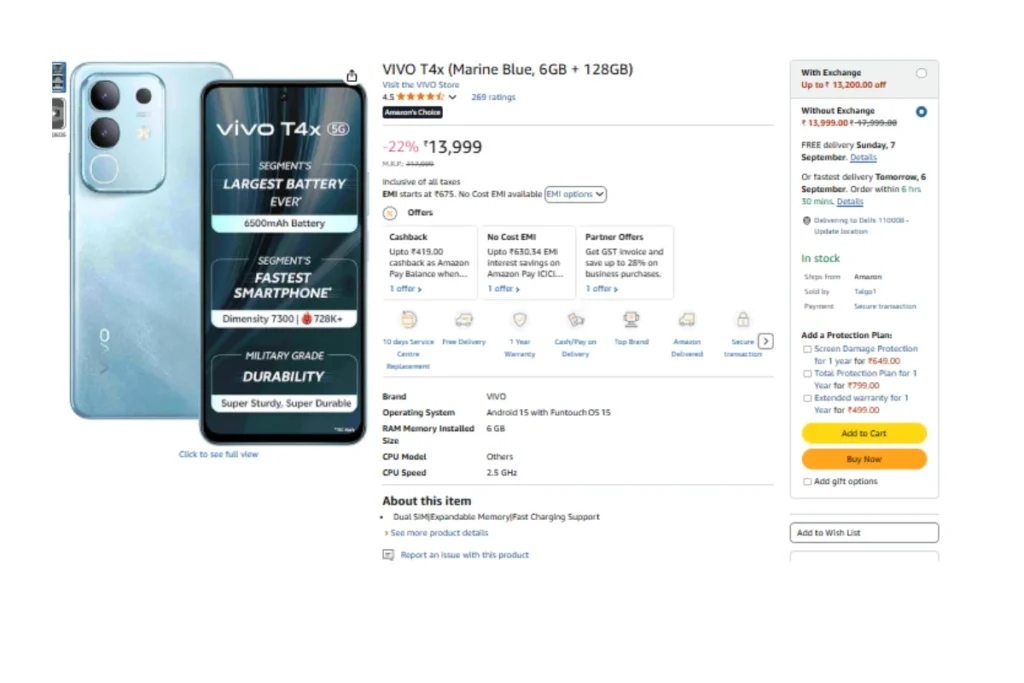 VIVO T4x 5G मोबाइल को Amazon Great Indian Festival Sale शुरू होने से पहले 22 फीसदी की छूट के साथ लिस्ट किया गया है। साइट पर इसका दाम 17999 रुपये निर्धारित किया गया है। हालांकि, डील में इसे 13999 रुपये के साथ घर पर मंगवा सकते हैं।