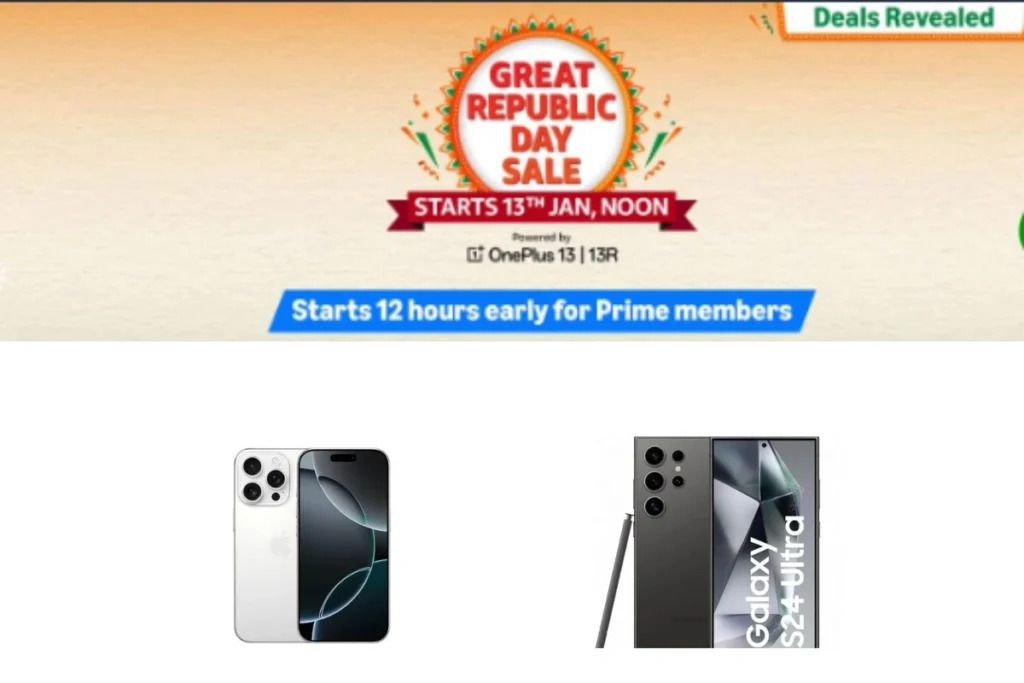 Amazon Great Republic Day Sale: गणतंत्र दिवस से पहले ऑन लाइन शॉपिंग कंपनी अमेजन अपने ग्राहकों के लिए “अमेजन ग्रेट रिपब्लिक डे सेल” लेकर आ रही है। ये ऑफर से भरी सेल 13 जनवरी दोपहर 12 बजे से लाइव होगी। कंपनी ने अभी से ही इसके ऑफर और प्रोडक्ट की जानकारी दे दी है। इस बीच अगर आप कोई महंगा फोन खरीदना चाहते हैं तो इस खबर को जरुर जान लीजिए। दरअसल, Sale से पहले सैमसंग और एप्पल के सबसे महंगे SmartPhone में गिने जाने वाले iPhone 16 Pro और Samsung Galaxy S24 Ultra के रेट कम हो गए हैं। इतना ही नहीं Redmi 13 5G, realme Narzo N65 5G और vivo T3x 5G फोन भी सस्ते में खरीदने का मौका मिलने वाला है। चलिए आपको सेल में मिलने वाले और अभी से ही जिन फोन पर छूट मिल रही है, उनके बारे में बताते हैं।