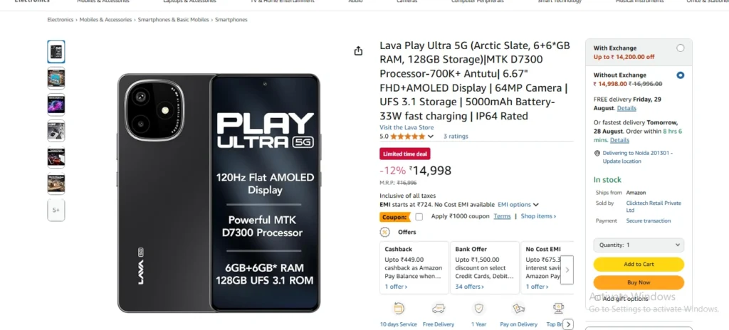 Lava Play Ultra 5G फोन ऑन लाइन शॉपिंग कंपनी अमेजन सेल पर 12 फीसदी के डिस्काउंट पर मिल रहा है। इस डील के बाद इसे 16996 रुपए की जगह 14998 रुपए में खरीदा जा सकता है। ग्राहक के 1998 रुपए बचेंगे। बजट कम होने पर 724 रुपए की EMI बनवा सकते हैं। वहीं, बैंक ऑफर्स का भी लाभ लिया जा सकता है।