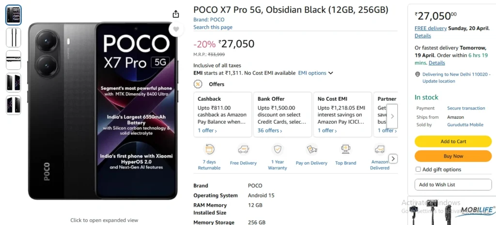 Amazon Sale पर POCO X7 Pro 5G फोन 20 फीसदी की छूट मिल रहा है। इस डील के बाद आपको ये 33999 रुपए की जगह 27050 रुपए में मिलेगा।