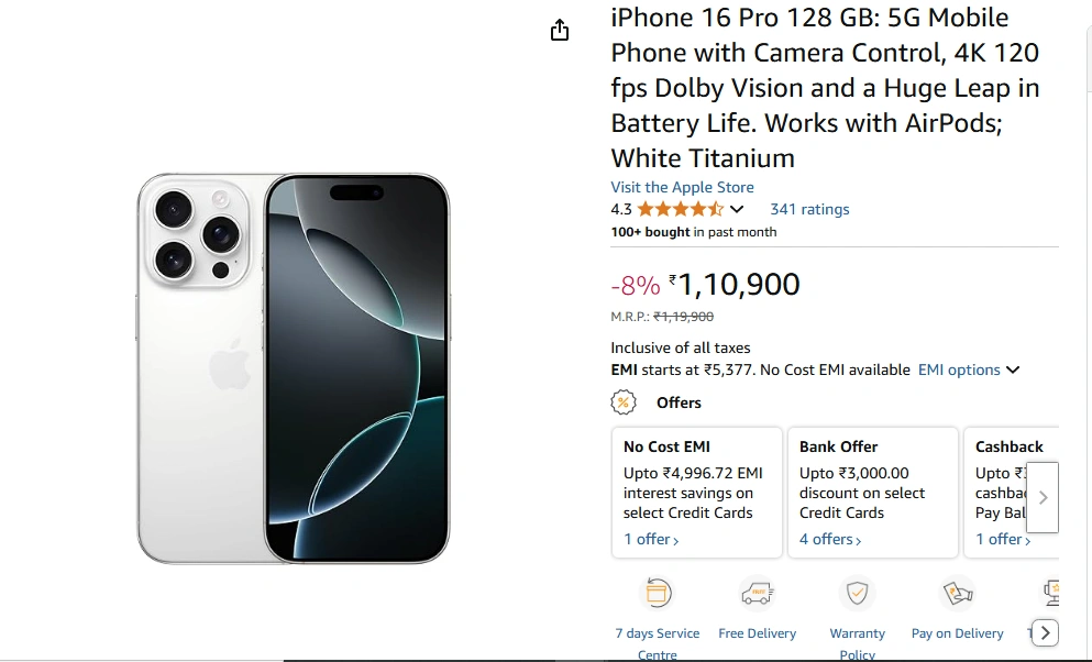 Amazon Sale में iPhone 16 Pro को 8 फीसदी छूट पर खरीदा जा सकता है। इस डिस्काउंट के बाद ये 119900 रुपए वाला फोन 110900 रुपए में मिलेगा।