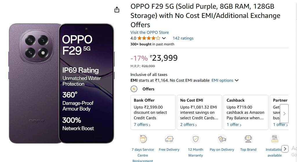 ओप्पो का सस्ता और टिकाऊ स्मार्टफोन OPPO F29 5G भी सस्ता हो गया है। इस पर अमेजन सेल 17 फीसदी का डिस्काउंट दे रहा है।