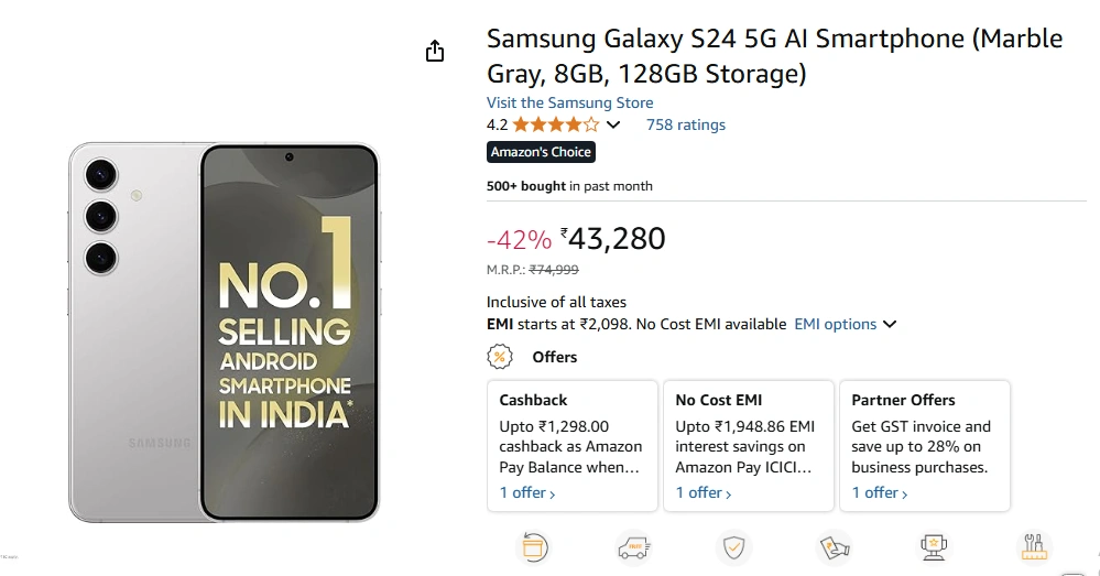 अमेजन सेल से Samsung Galaxy S24 5G AI Smartphone 42% छूट पर खरीदें