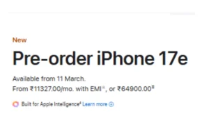 अगर एप्पल आईफोन 17ई की कीमत की बात करें, तो इसका दाम 64900 रुपये 256GB स्टोरेज वेरिएंट के लिए और 512GB वेरिएंट के लिए 84900 रुपये देने होंगे। इस नए आईफोन को कंपनी की आधिकारिक वेबसाइट और ऑनलाइन प्लेटफॉर्म से 11 मार्च से खरीद सकते हैं।