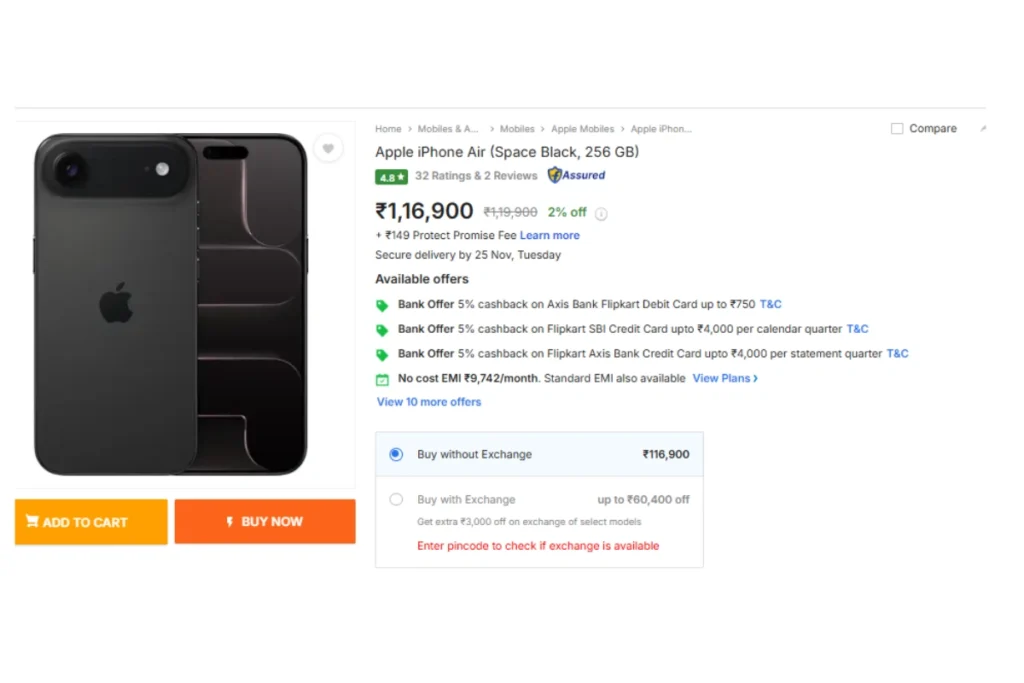 शॉपिंग प्लेटफॉर्म फ्लिपकार्ट पर एप्पल आईफोन एयर मॉडल को हैरान करने वाले ऑफर के साथ उतारा गया है। वेबसाइट पर 2 फीसदी की छूट मिल रही है। इसका असली दाम 119900 रुपये रखा गया है। हालांकि, डील के तहत इसे 116900 रुपये में अपना बना सकते हैं। साथ ही इस पर कैशबैक, बैंक ऑफर्स और कई अन्य पार्टनर डील्स का लाभ भी दिया जा रहा है। मगर भारी-भरकम बचत तो एक्सचेंज ऑफर के जरिए हो सकती है।