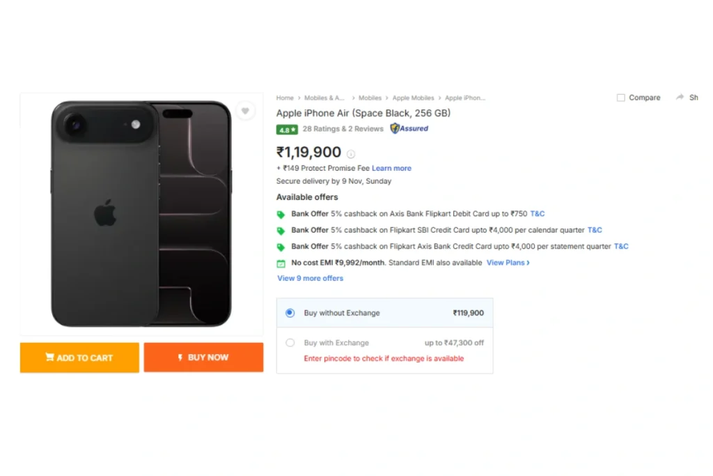 शॉपिंग वेबसाइट फ्लिपकार्ट पर एप्पल आईफोन एयर फोन पर फिलहाल कोई ऑफर उपलब्ध नहीं है। मगर फिर भी आप कैशबैक, बैंक ऑफर्स और पार्टनर डील्स के दम पर तगड़ी सेविंग कर सकते हैं। आप सोच रहे होंगे कि इस आईफोन पर 47300 रुपये तक की बचत कैसे होगी? तो आपको बता दें कि इसके लिए आपको फ्लिपकार्ट के एक्सचेंज ऑफर का लाभ उठाना होगा।