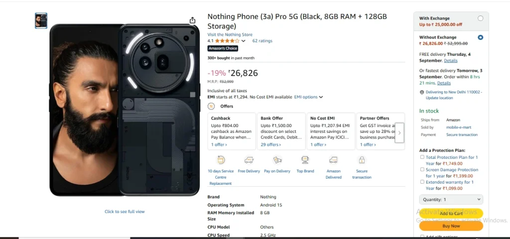 Amazon Great Indian Festival Sale: साल की सबसे बड़ी अमेजन ग्रेट इंडियन फेस्टिवल सेल 2025 दीवाली से पहले शुरु होने वाली है। इसका टीजर आ चुका है। लेकिन अभी तक तारीख नहीं आयी है। लेकिन इस बीच अमेजन सेल पर Nothing Phone (3a) फोन सस्ता हो गया है। Ranveer Singh जानी-मानी Nothing कंपनी के ब्रांड एंबेसडर हैं। नथिंग फोन 3 ए अभी हालहि में लॉन्च हुआ था। लेकिन इसे ऑन लाइ शॉपिंग कंपनी अमेजन सेल से सस्ते में 6000 से ज्यादा की छूट पर खरीदने का मौका मिल रहा है।