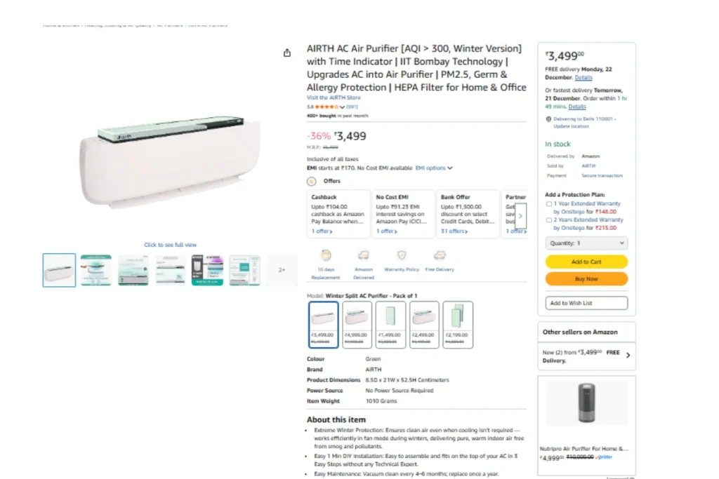 अमेजन साइट पर AIRTH AC एयर प्यूरीफायर 36 प्रतिशत की छूट के साथ मिल रहा है। इसका असली दाम 5499 रुपये रखा गया है, मगर डील के तहत इसे 3499 रुपये में खरीद सकते हैं। यह एयर प्यूरीफायर टाइम इंडिकेटर के साथ PM2.5, जर्म और एलर्जी से सुरक्षा देता है।