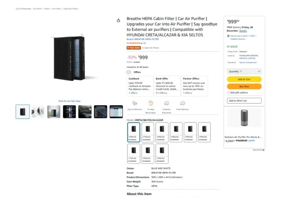 Breathe HEPA केबिन फिल्टर एयर प्यूरीफायर घर के साथ कार में भी काम करता है। अमेजन साइट पर इसे 50 फीसदी छूट के साथ उतारा गया है। इसकी कीमत 1999 रुपये रखी गई है, मगर डिस्काउंट के तहत इसे 999 रुपये पर खरीद सकते हैं।