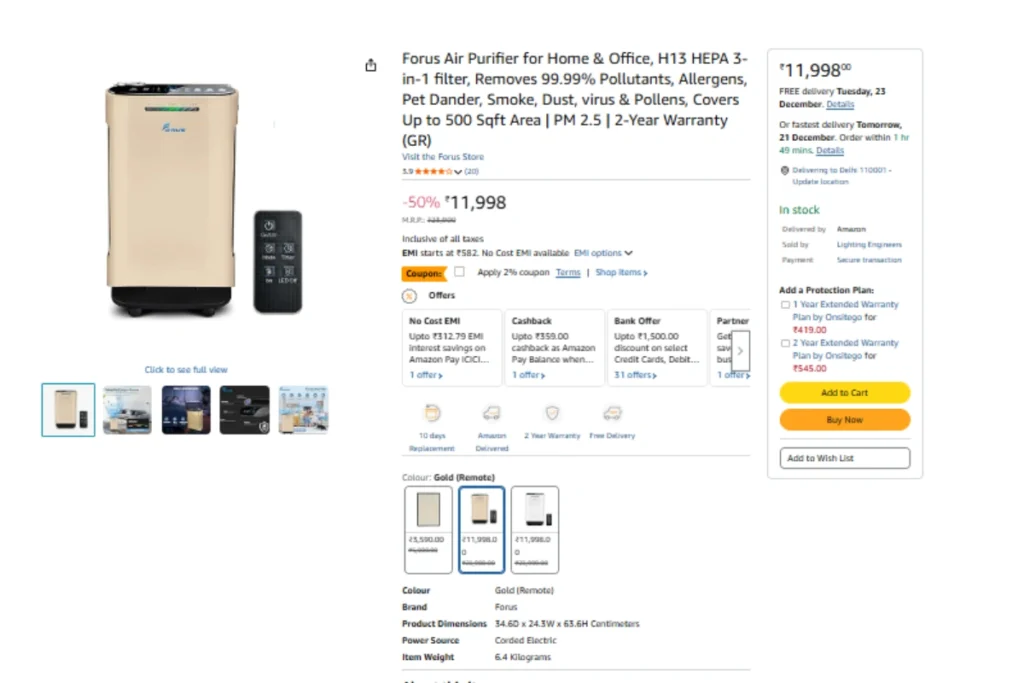 Forus एयर प्यूरीफायर घर और ऑफिस के लिए बढ़िया विकल्प साबित हो सकता है। इसे 50 फीसदी की छूट के साथ खरीदा जा सकता है। इसका प्राइस 23900 रुपये है, मगर डील में इसे 11998 रुपये के साथ खरीद सकते हैं। यह 99.99% प्रदूषकों, एलर्जी पैदा करने वाले तत्वों, पालतू जानवरों के बालों, धुएं, धूल, वायरस और पराग कणों को हटाता है। इसमें 2 साल की वारंटी मिलती है।