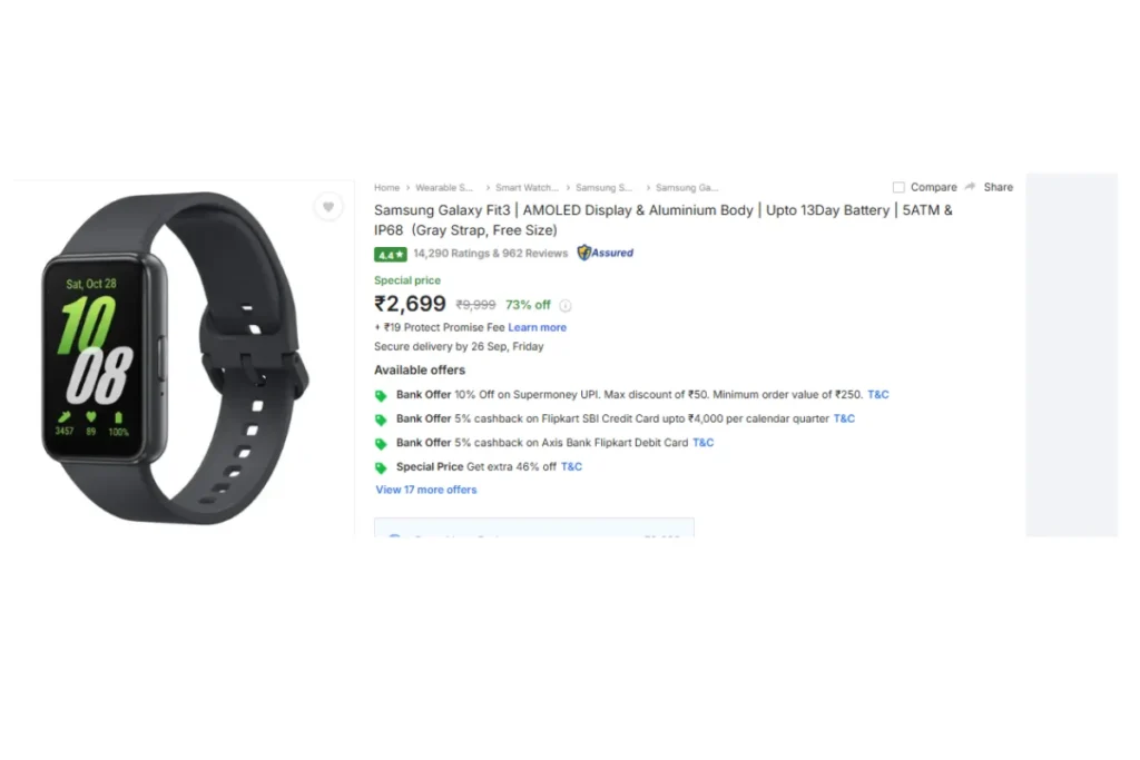 सैमसंग गैलेक्सी फिट 3 को फ्लिपकार्ट बिग बिलियन डेज सेल में 73 प्रतिशत की बंपर बचत के साथ लिस्ट किया गया है। इसकी एमआरपी 9999 रुपये निर्धारित की गई है। हालांकि, इसे अपना बनाने के लिए 2699 रुपये का भुगतान करना होगा। ग्राहकों ने अभी तक इस स्मार्टवॉच को 4.4 स्टार रेटिंग दी है।