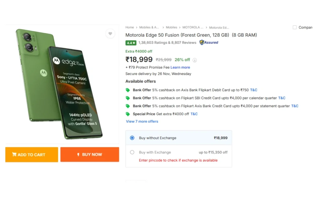ऑनलाइन शॉपिंग प्लेटफॉर्म पर फ्लिपकार्ट ब्लैक फ्राइडे सेल में मोटोरोला एज 50 फ्यूजन 5जी को 26 प्रतिशत की छूट के साथ बिक्री के लिए लिस्ट किया गया है। इसका असली दाम 25999 रुपये तय किया गया है। हालांकि, ऑफर के तहत इसे खरीदने के लिए 18999 रुपये का भुगतान करना होगा। साथ ही कैशबैक, बैंक ऑफर्स और कई अन्य पार्टनर डील्स का भी लाभ मिल सकता है।