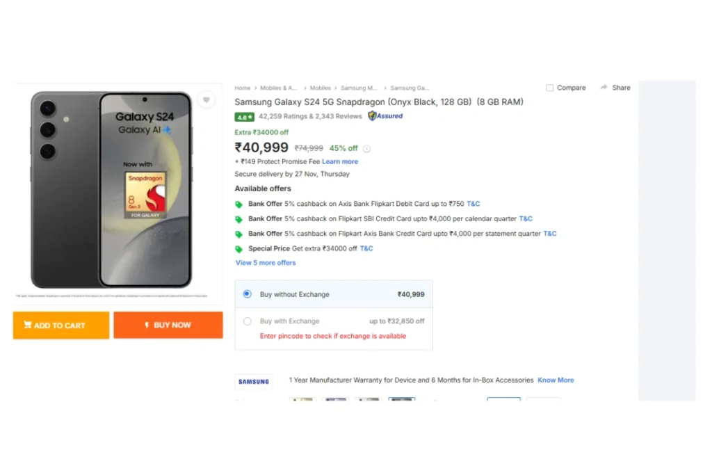 शॉपिंग प्लेटफॉर्म फ्लिपकार्ट पर बताया गया है कि सैमसंग गैलेक्सी एस24 5जी मोबाइल को 45 फीसदी के डिस्काउंट के साथ बिक्री के लिए लिस्ट किया गया है। इसका असली प्राइस 74999 रुपये तय किया गया है। मगर ऑफर के तहत इसे खरीदने के लिए 40999 रुपये का भुगतान करना होगा। ऐसे में इस डील से सीधे तौर पर 34000 रुपये की बचत हो सकती है। साथ ही कैशबैक, बैंक ऑफर्स और पार्टनर डील्स का भी मुनाफा लिया जा सकता है।