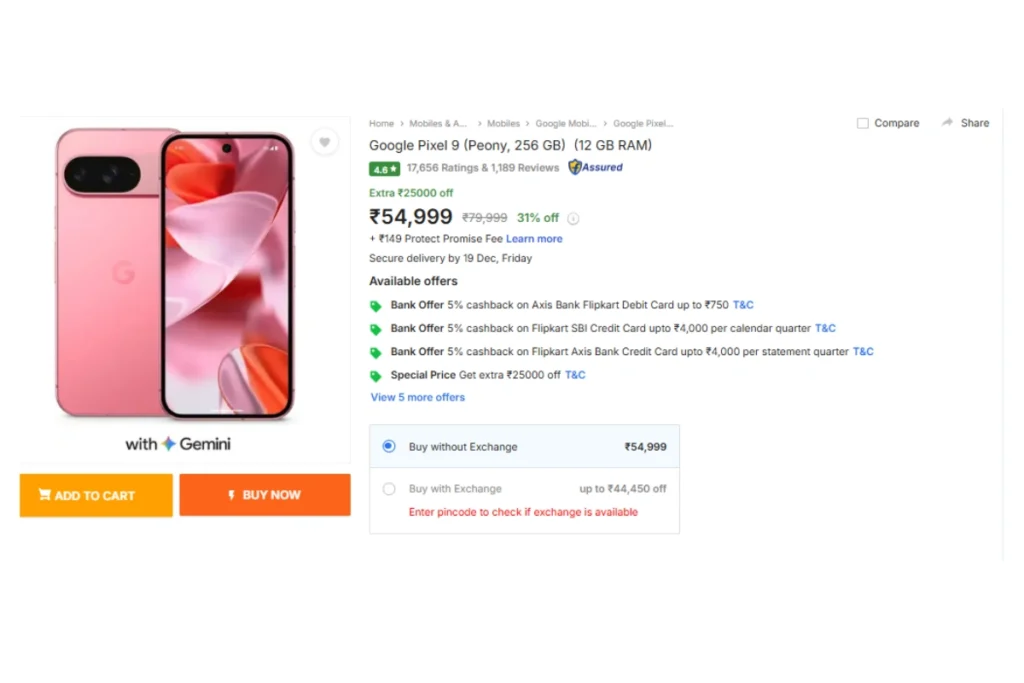 वहीं, गूगल पिक्सल 9 फ्लैगशिप मोबाइल पर फ्लिपकार्ट एंड ऑफ सीजन सेल में 44450 रुपये तक का एक्सचेंज ऑफर दिया जा रहा है। इस ऑफर का लाभ लेने के लिए आपको पहले फ्लिपकार्ट पर अपने एरिया का पिनकोड डालकर ऑफर को चेक करना होगा। अगर डील उपलब्ध रहती है, तो मांगी गई सभी जानकारी देने के बाद एक सही कंडीशन में पुराना फोन भी जमा करना होगा।