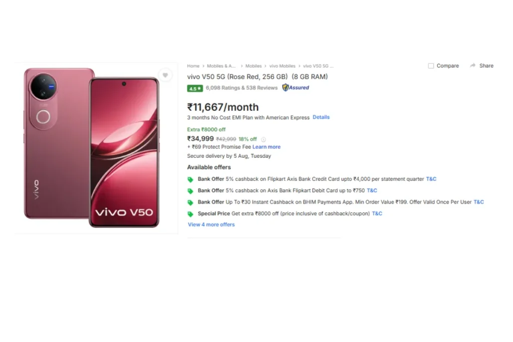 फ्लिपकार्ट फ्रीडम सेल 2025 में Vivo V50 5G पर होगी 18% की बचत