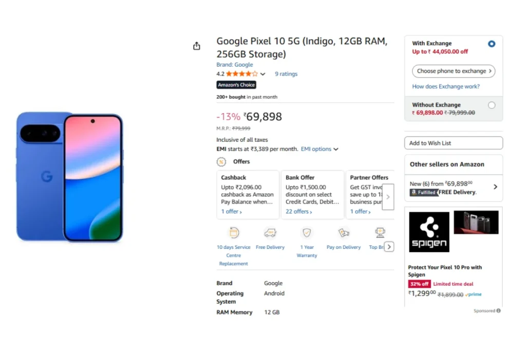 शॉपिंग साइट अमेजन पर गूगल पिक्सल 10 5जी फोन को 13 फीसदी के डिस्काउंट के साथ उतारा गया है। ऐसे में इसका असली दाम 79999 रुपये रखा गया है। मगर ऑफर के तहत इसे 69898 रुपये में ऑनलाइन खरीद सकते हैं। इसके साथ इस मोबाइल पर कैशबैक, बैंक ऑफर्स और पार्टनर डील्स का भी लाभ उठा सकते हैं।