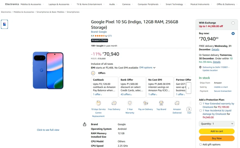 अमेजन सेल पर गूगल पिक्सल 10 5जी फोन 11 फीसदी की छूट पर मिल रहा है। इस ऑफर के बाद ये 79999 रुपए की जगह 70940 रुपए में मिलेगा।