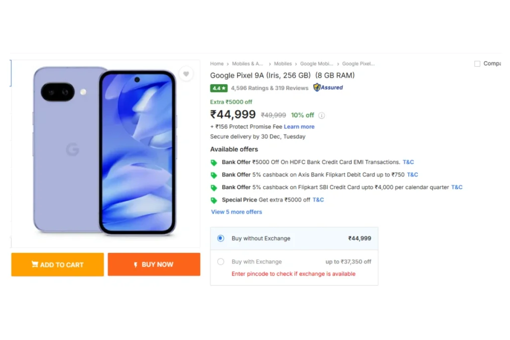 फ्लिपकार्ट ईयर एंड सेल 24 से 29 दिसंबर 2025 तक चलेगी। इस सेल में गूगल पिक्सल 9ए प्रीमियम मोबाइल को 10 फीसदी की छूट के साथ उतारा गया है। इस मोबाइल की एमआरपी 49999 रुपये रखी गई है। मगर ऑफर के तहत इसे खरीदने के लिए 44999 रुपये चुकाने होंगे। ऐसे में इस डील में 5000 रुपये की बचत होने की उम्मीद है। साथ ही कैशबैक, बैंक ऑफर्स और पार्टनर डील्स का भी लाभ मिल सकता है।