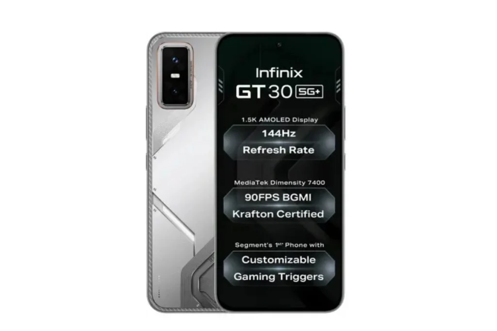 Infinix GT 30 5G परफॉर्मेंस-ड्रिवन गेमिंग स्मार्टफोन माना जाता है। इसका लुक इसे बेहद खास बनाता है। इसमें साइबर मेचा एस्थेटिक और कस्टमाइज़ेबल LED लाइट्स लगी हुई हैं जो कि, दिखने में बहुत अच्छी लगती है। गेमर्स के लिए इसमें GT शोल्डर गेमिंग ट्रिगर्स के साथ 144Hz रिफ्रेश रेट दिया गया है। इसके साथ ही 1.5K AMOLED डिस्प्ले दी गई है। इस फोन में मीडियाटेक डाइमेंशन 7400 प्रोसेसर मिलता है। जिसकी वजह से इसकी स्पीड और परफॉर्मेंस बहुत ही अच्छी हो जाती है। इसमें बाईपास चार्जिंग के साथ वेपर चैंबर कूलिंग वाली 5500mAh की बैटरी दी गई है। इस फोन पर लंबे समय तक गेम खेलने के बाद भी ये गर्म नहीं होता है। इनफिनिक्स जीटी 30 स्मार्टफोन में वन-टैप Infinix AI एन्हांसमेंट दिया गया है। उइसके साथ ही 64MP का सोनी कैमरा मिलता है। ये एंड्रॉइड 15 पर ऑपरेट करता है।