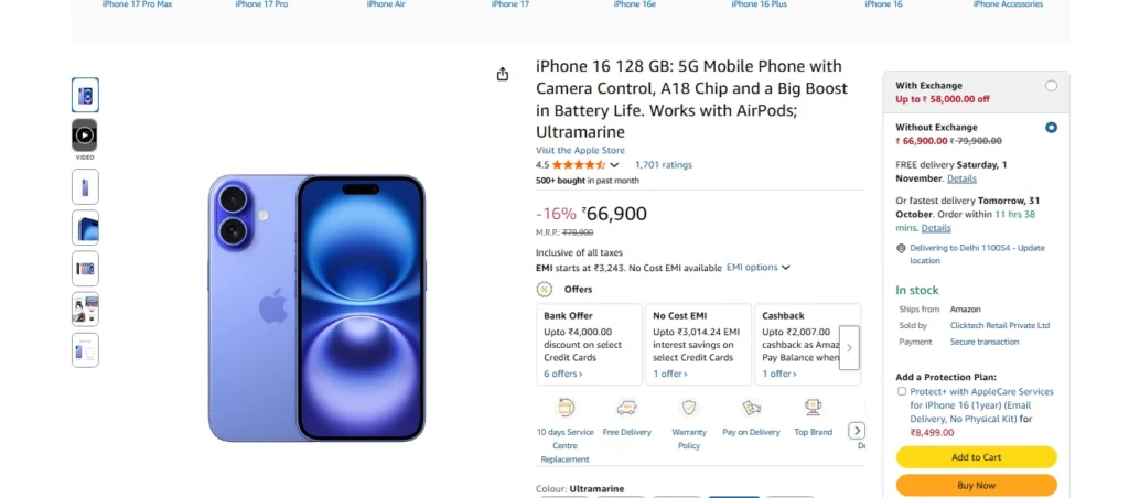 iPhone 16 की कीमत और अमेजन सेल ऑफर