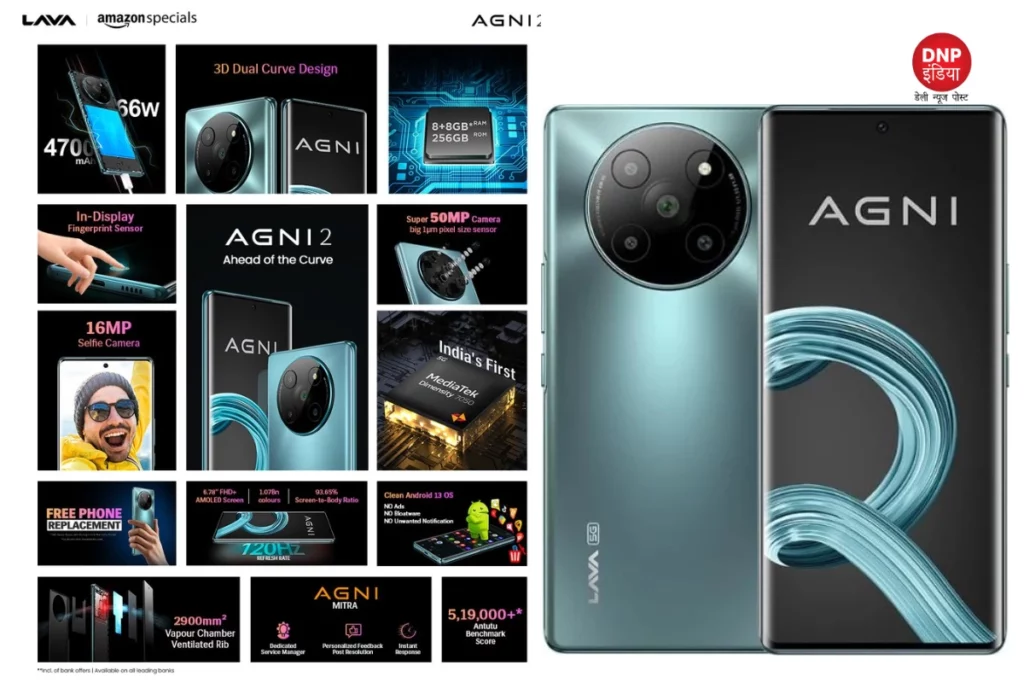 Lava Agni 2 फोन में 6.78 इंच का फुलएचडी प्लस कर्व्ड एमोलेड डिस्प्ले दिया सगया है, जो कि 120 Hz रिफ्रेश रेट और 1.07 बिलियन कलर को सपोर्ट करती है। इसके अलावा इस Lava Agni 2 5G देश में लॉन्च हुआ पहला स्मार्टफोन है, जिसमें MediaTek Dimensity 7050 प्रोसेसर दिया गया है। रैम और स्टोरेज की बात करें, तो इसमें 8GB रैम का सपोर्ट और 16GB तक वर्चुअली रैम का सपोर्ट दिया गया है, तो वहीं इस हैंडसेट में हाईएस्ट 256GB तक की स्टोरेज दी गई है। फोन Android 13.0 पर बेस्ड है और इसमें तीन साल तक सिक्योरिटी अपडेट और दो साल के एंड्रॉयड अपडेट भी कंपनी की तरफ से दिए जाएंगे। फोन में 50एमपी के चार रियर कैमरे पैनल का सपोर्ट दिया गया है।