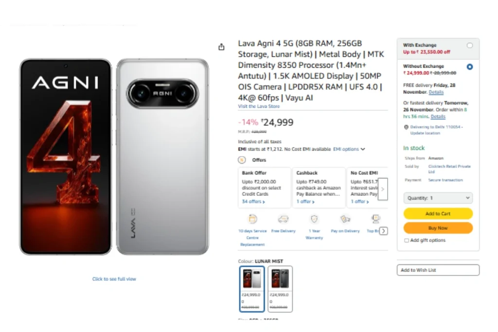शॉपिंग वेबसाइट अमेजन पर लावा अग्नि 4 5जी मोबाइल को पहली सेल में 14 फीसदी के डिस्काउंट के साथ बिक्री के लिए उतारा गया है। इसकी एमआरपी 28999 रुपये रखी गई है। मगर इसे खरीदने के लिए 24999 रुपये का भुगतान करना होगा। इस तरह से इस डील में सीधे तौर पर 4000 रुपये की सेविंग होगी। साथ ही कैशबैक, बैंक ऑफर्स और पार्टनर ऑफर्स के जरिए अन्य लाभ भी लिए जा सकते हैं।