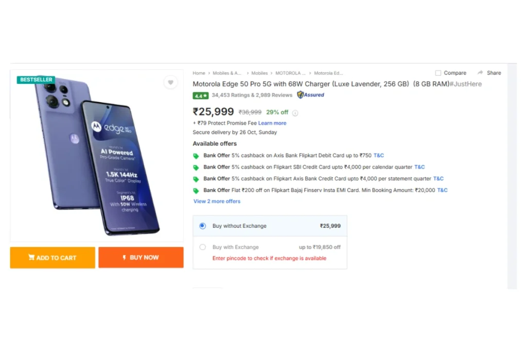 वहीं, मोटोरोला एज 50 प्रो 5जी फोन पर अतिरिक्त सेविंग करने के लिए ग्राहकों को एक्सचेंज ऑफर का लाभ लेना होगा। फ्लिपकार्ट के मुताबिक, इस मोबाइल पर एक्सचेंज ऑफर के तहत 19850 तक की छूट मिल सकती है। ऐसे में फोन का दाम लगभग 6000 रुपये के करीब रह जाएगा। हालांकि, इस ऑफर का फायदा लेने के लिए कस्टमर्स को सबसे पहले अपने एरिया का पिनकोड डालकर ऑफर की उपलब्धता चेक करनी होगी। ऑफर मौजूद होने पर फ्लिपकार्ट की सभी शर्तों को मानना होगा। साथ ही अपने पुराने फोन को सही कंडीशन में फ्लिपकार्ट को जमा करना होगा।